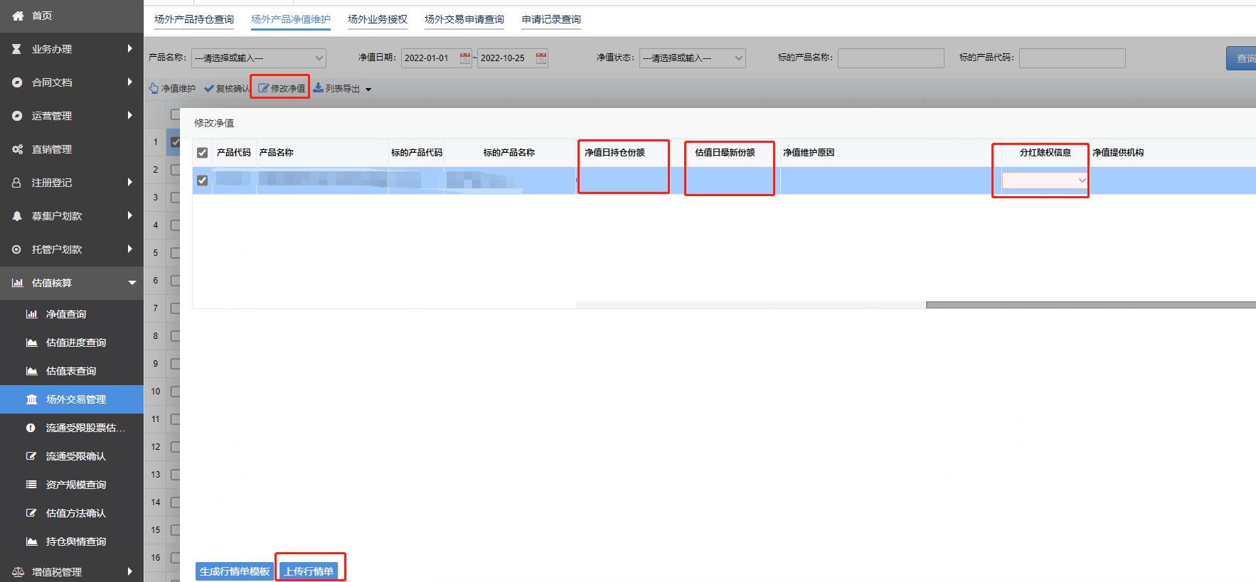当场外产品发生份额调增调减、份额转换、分红再投等不涉及资金变动或资金变动迟于份额变动的相关业务,而获取的第三方机构直接发送/提供的数据又不齐整,如缺乏持仓份额、累计净值等,将无法通过第三方数据判断期间是否存在业务,此时估值业务无法进行。因此,在开放、穿透开放等涉及特殊业务的估值日期,当获取的第三方机构直接发送/提供的数据并不齐整时,两种模式下都需要通过【场外产品净值维护】菜单点击“修改净值”补充相应数据,并通过“上传行情单”按钮上传相关证明材料,如持仓份额证明材料等。